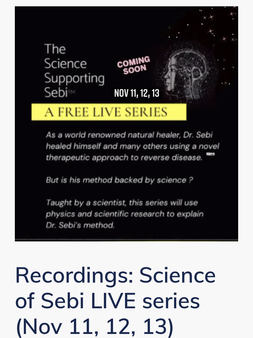 Recordings of the mind blowing and life changing 3 part live series “The Science Supporting Sebi” (Nov 11,12,13)